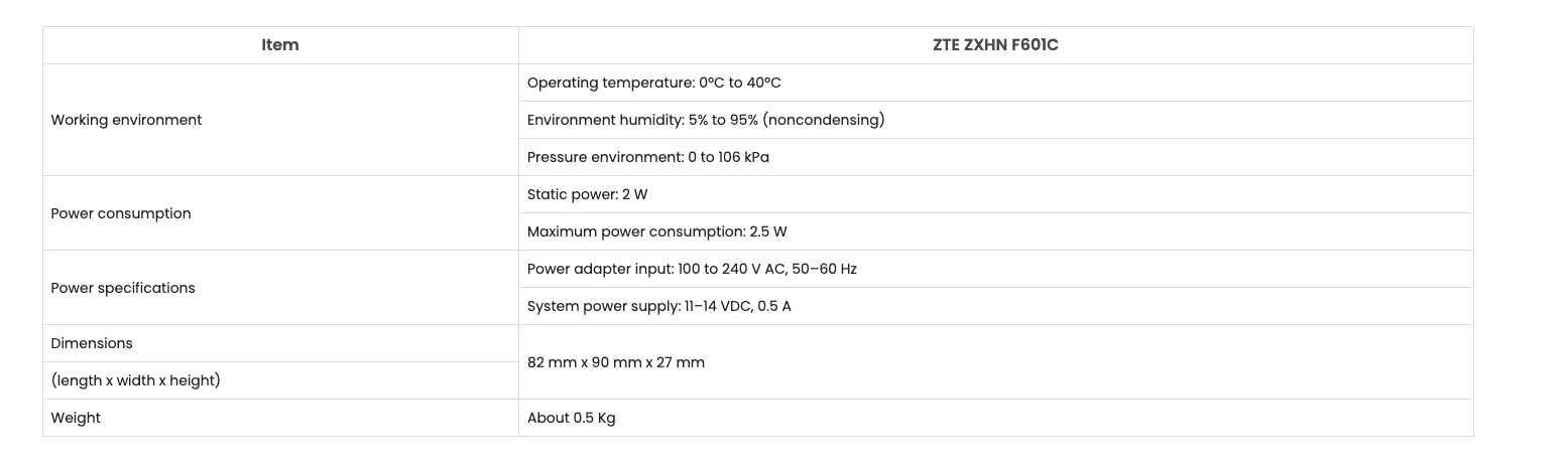 ZTE ZXHN F601 es un terminal de red óptica (ONT) GPON que cumple con ITU-T G.984.x y G.988 con un puerto Ethernet de 10/100/1000 Mbps para escenario FTTH y proporciona 2.488 Gbps de bajada y 1.244 Gbps de carga GPON. . Interfaz de enlace ascendente, incluye puerto CATV. ZXHN F601 se aplica en dos escenarios: uno proporciona una interfaz GE para PC o portátiles directamente. El otro está trabajando junto con un RG para brindar servicio de video garantizado y acceso a Internet de alta velocidad.