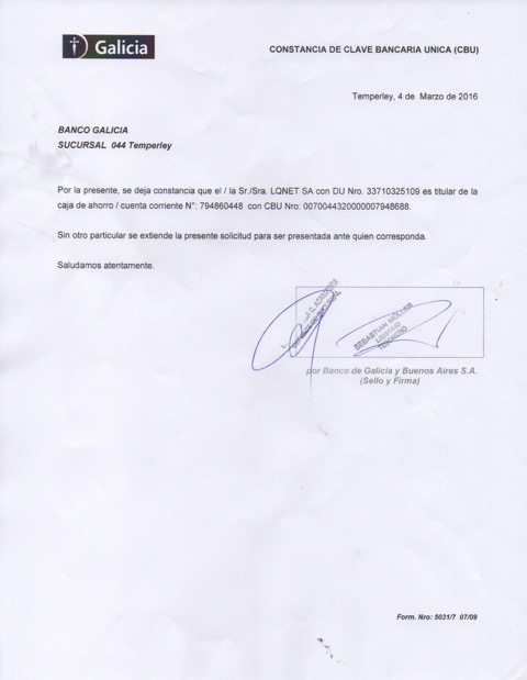 Si tenes cheques fisicos, hacerlos cruzados para depositar, a nombre de LQNET SA, sin la leyenda “No a la orden”.