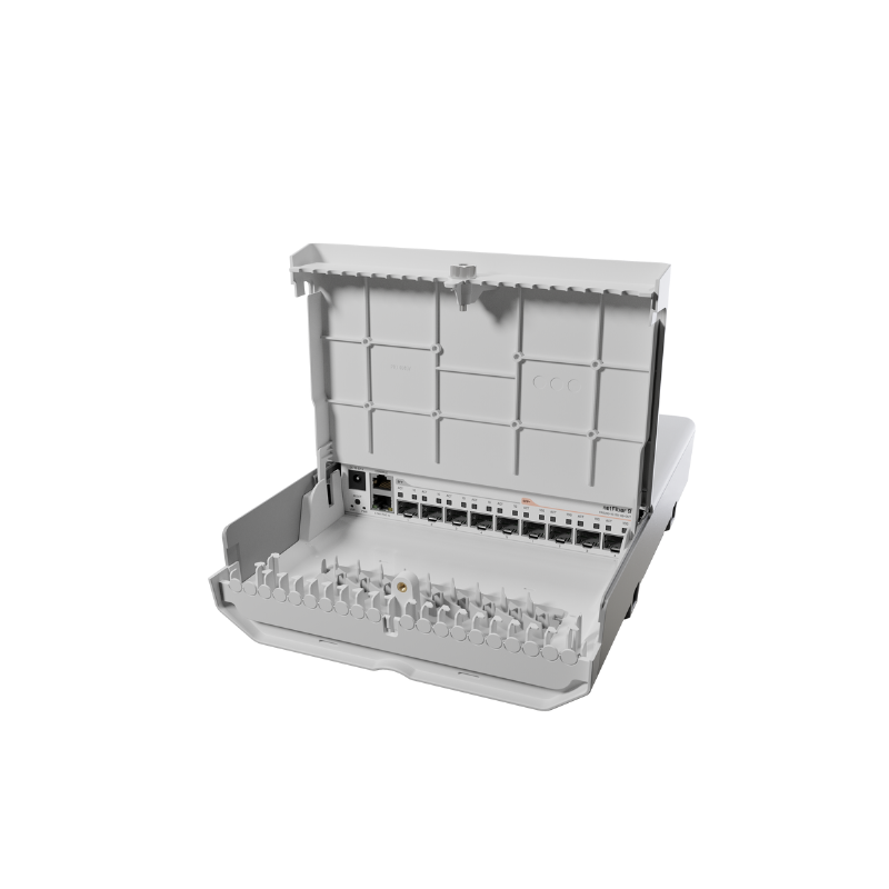 netFiber 9 cuenta con CPU ARM v7 de 800MHz, 256MB de RAM, 4 puertos 10G SFP+, 5 puertos 1G SFP, 1 puerto Gigabit Ethernet (PoE-In), licencia RouterOS L5, gabinete exterior, kit de montaje, fuente de alimentación e inyector PoE.