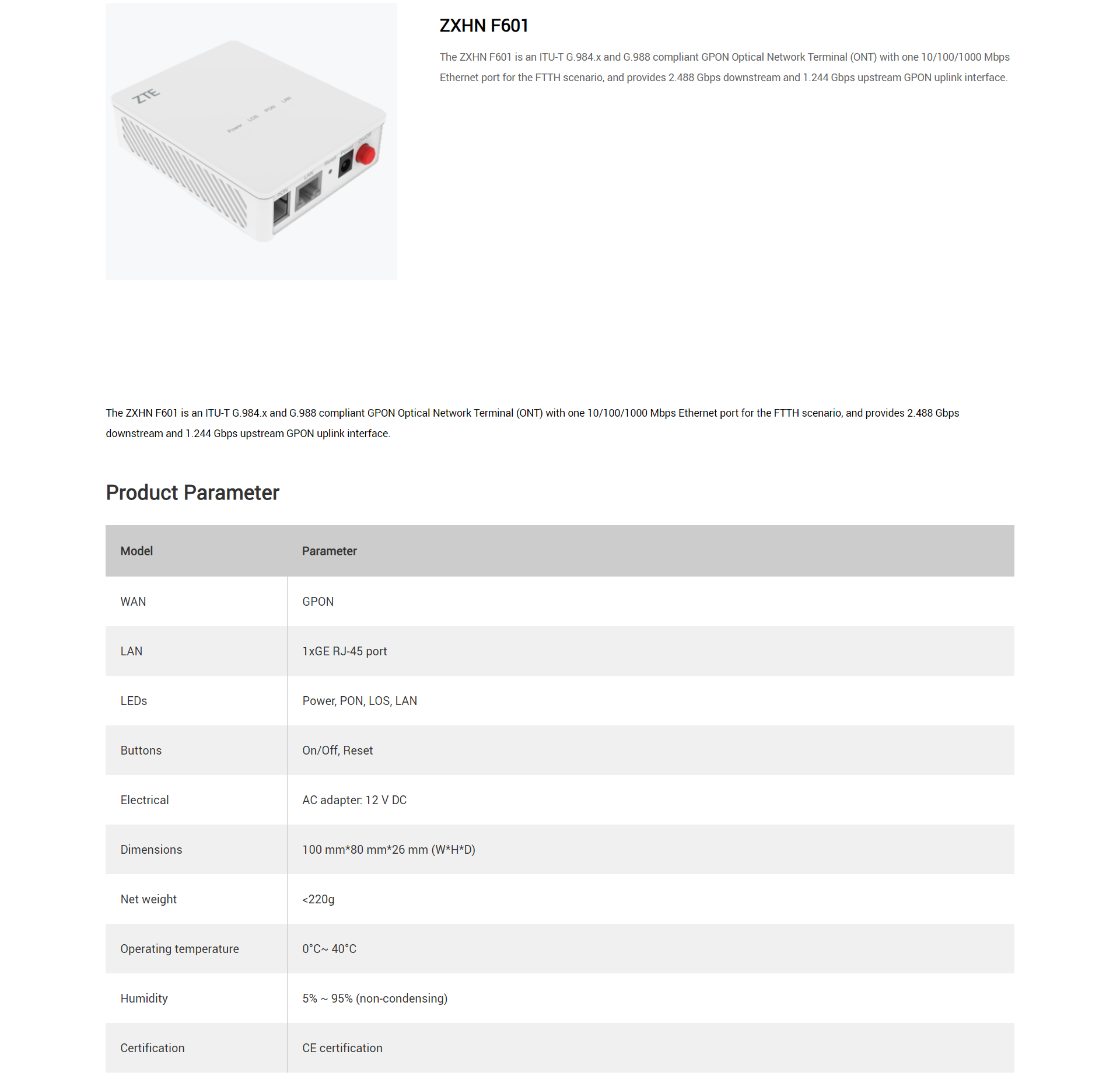 ZTE ZXHN F601 es un terminal de red óptica (ONT) GPON que cumple con ITU-T G.984.x y G.988 con un puerto Ethernet de 10/100/1000 Mbps para escenario FTTH y proporciona 2.488 Gbps de bajada y 1.244 Gbps de carga GPON. . interfaz de enlace ascendente. ZXHN F601 se aplica en dos escenarios: uno proporciona una interfaz GE para PC o portátiles directamente. El otro está trabajando junto con un RG para brindar servicio de video garantizado y acceso a Internet de alta velocidad.